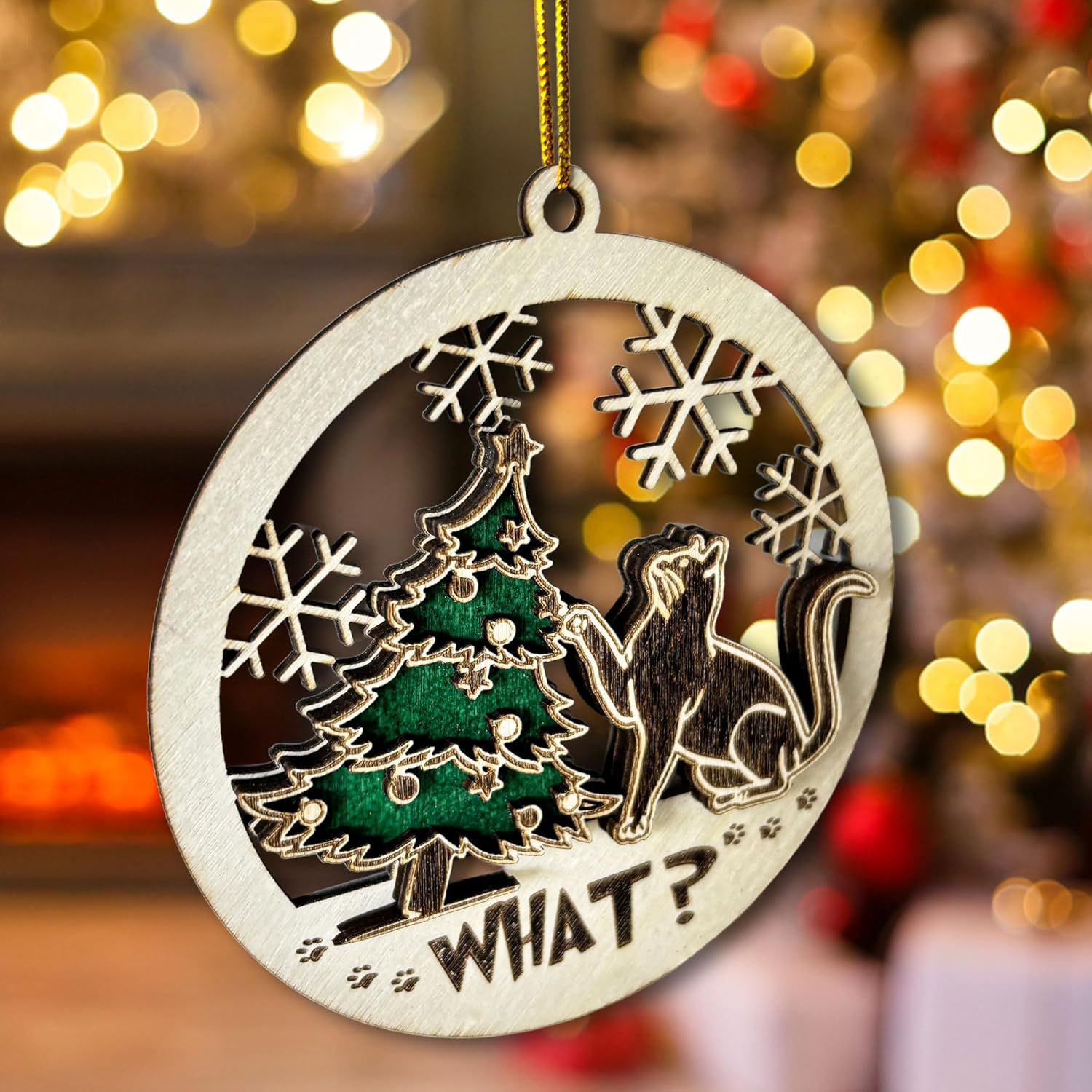 Celebrate the playful spirit of the season with this wooden black cat ornament. Showcasing a kitten tangled in tree decor, it’s perfect for pet parents and animal lovers. Adds a touch of humor and warmth to any Christmas tree.