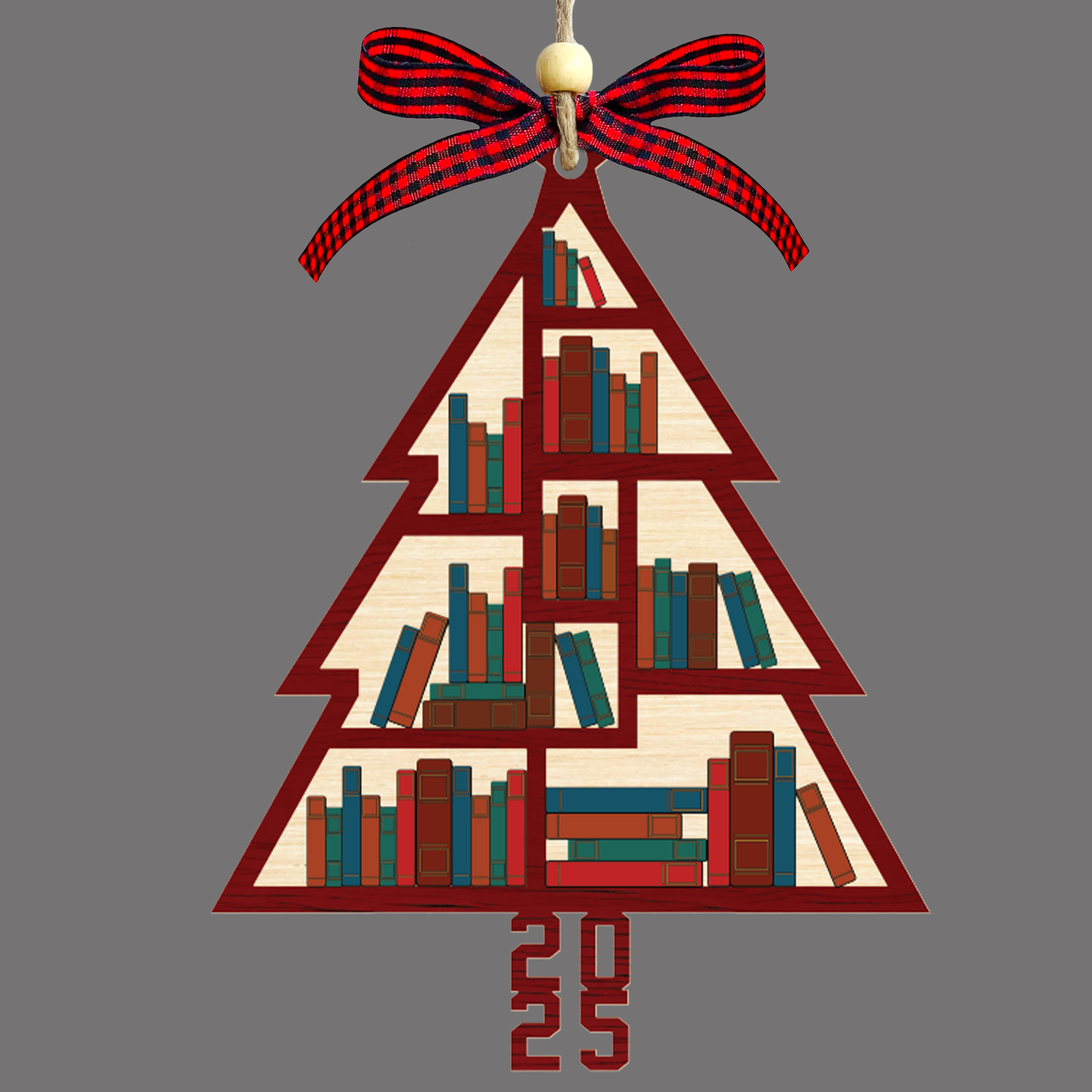Turn your tree into a library with this 2025 wooden bookshelf ornament. Laser-cut shelves hold miniature books, complete with a twine loop. A cozy, detailed tribute to every bibliophile’s happy place