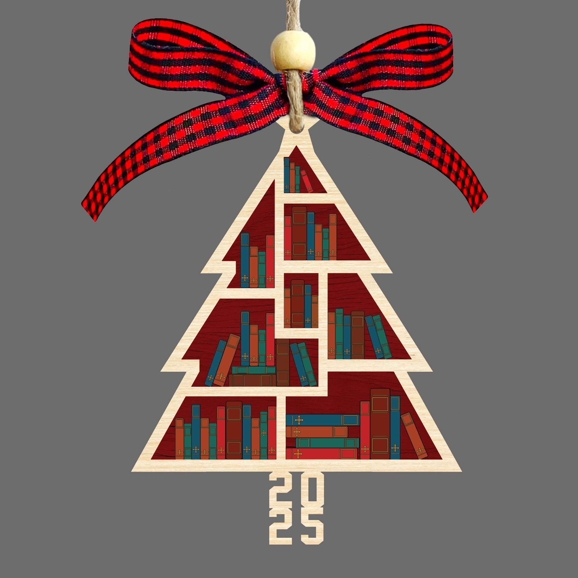 Nestle stories among the branches with this 2025 wooden ornament shaped like a Christmas tree made of books. Engraved with tiny titles and a star topper, it hangs by natural twine—pure magic for bookworms.