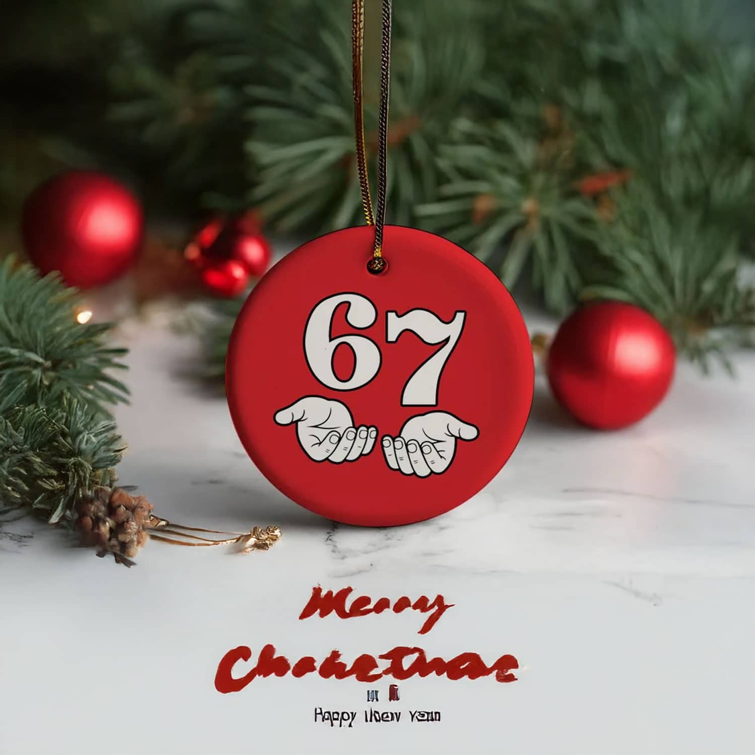 Celebrate the latest Gen Alpha trend with this Funny 6 7 Meme Ornament, a playful keepsake designed for fans of the viral Six Seven Christmas moment. Featuring a bold red background, clean white “67” typography, and iconic meme hand gestures, this ornament adds a modern, humorous touch to any Christmas tree. Perfect for teens, grandkids, meme lovers, and anyone who enjoys trendy holiday décor. A fun 2025 keepsake that brings personality and laughter to the season.
