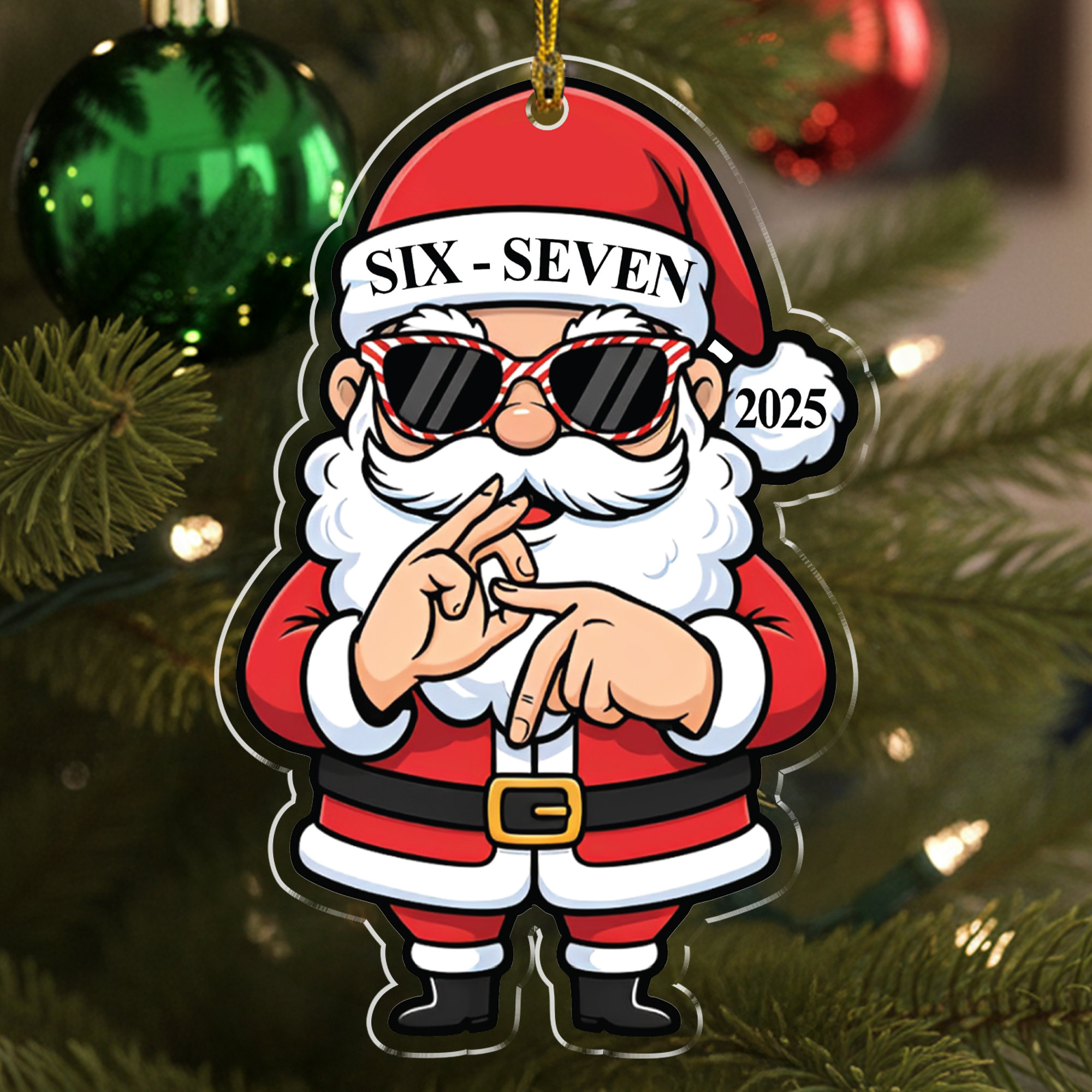 Give your Christmas tree a fun and stylish upgrade with the Santa Six Seven Hand Gesture Ornament 2025. Featuring a cool cartoon Santa wearing candy-cane sunglasses and the iconic Six-Seven hand sign, this festive ornament makes a perfect holiday gift for Santa lovers, ornament collectors, and anyone who enjoys unique and playful Christmas décor. Add personality and holiday spirit to your 2025 decorations with this standout design.